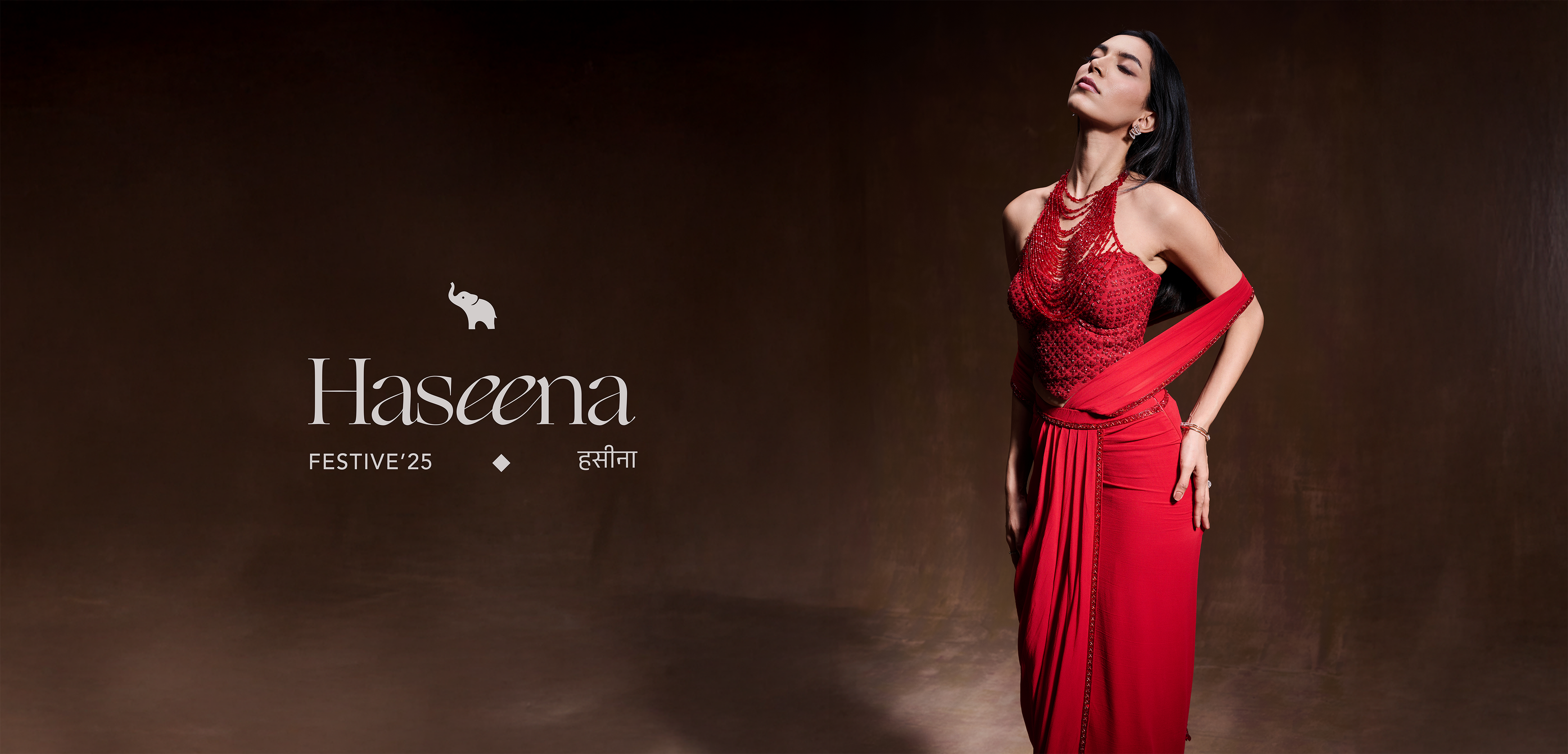 Inspired by the drama of couture and the allure of Bollywood divas, Haseena reimagines festive Indian wear with bold cuts, fluid drapes, and unapologetic glamour. It’s not just clothing — it’s a showstopper moment.