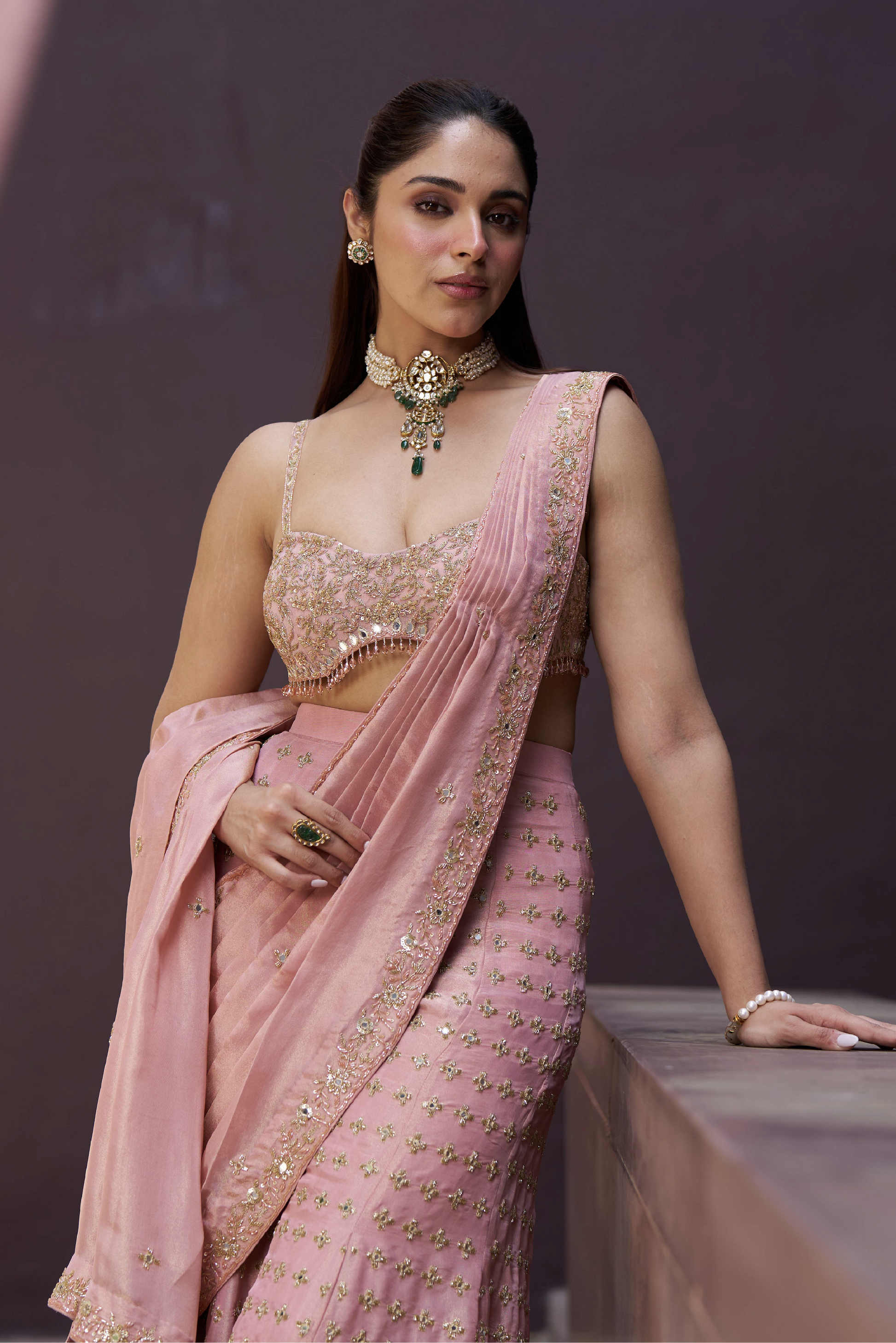 Gracefully combining tradition with modern elegance, this blush pink sharara drape set is a showstopper. The sharara features heavy cutdana work, creating a stunning, textured effect that adds sophistication and sparkle. Paired with a flowing drape, this set offers a contemporary twist on classic attire, perfect for weddings, receptions, and festive events. The soft blush pink hue enhances its timeless beauty, making it an ideal choice for those seeking both elegance and glamour.