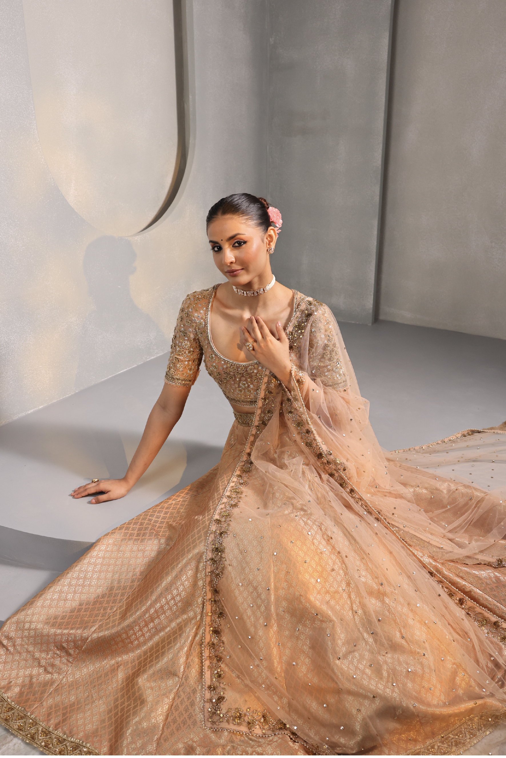 This stunning ensemble features a peach-toned lehenga in luxurious brocade fabric. The blouse, made from delicate net fabric, is beautifully adorned with matching 3D floral embroidery, creating a soft, elegant look. Complementing the outfit is a sheer net dupatta, finished with floral embroidery along the border, adding to the outfit's graceful and regal charm.
