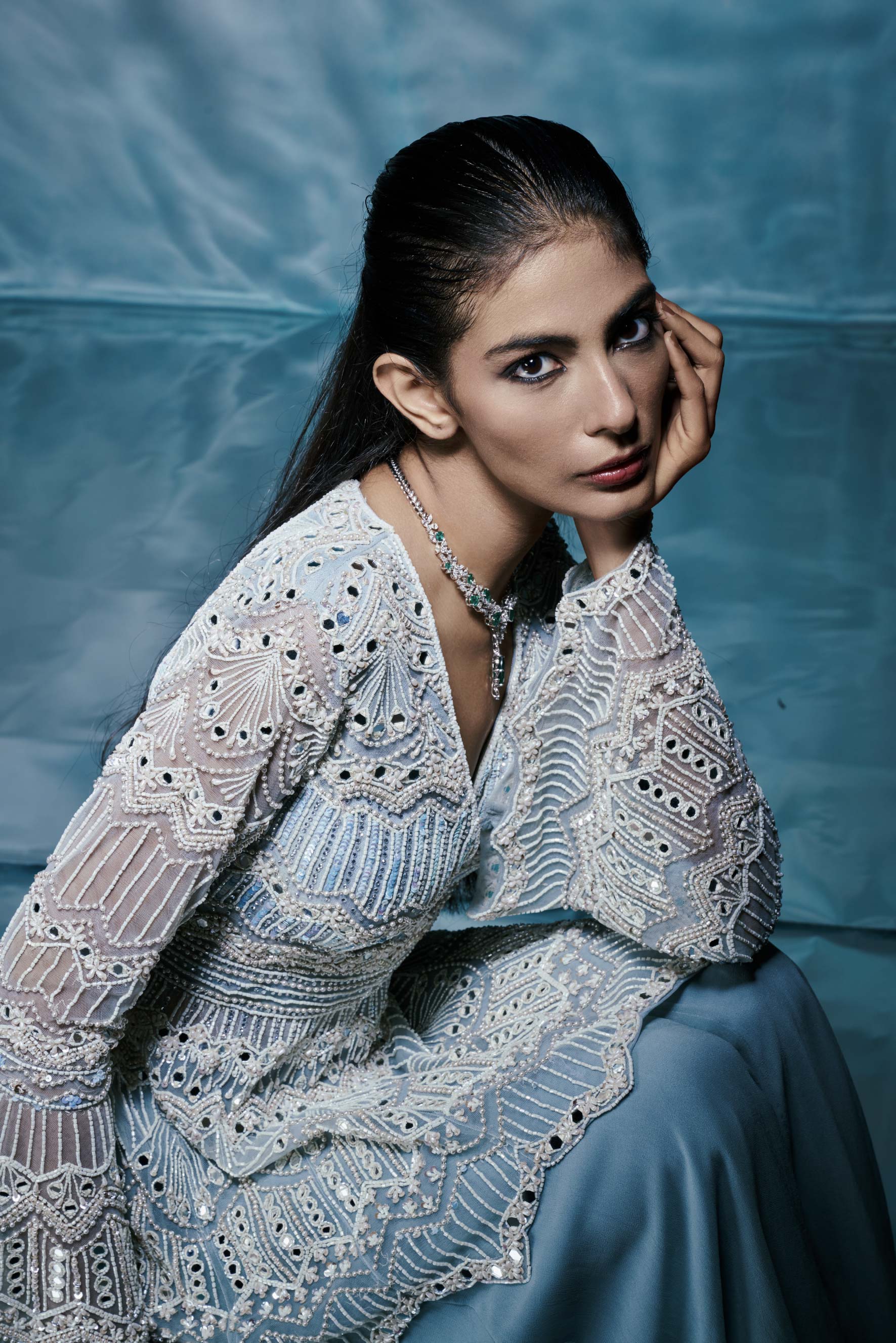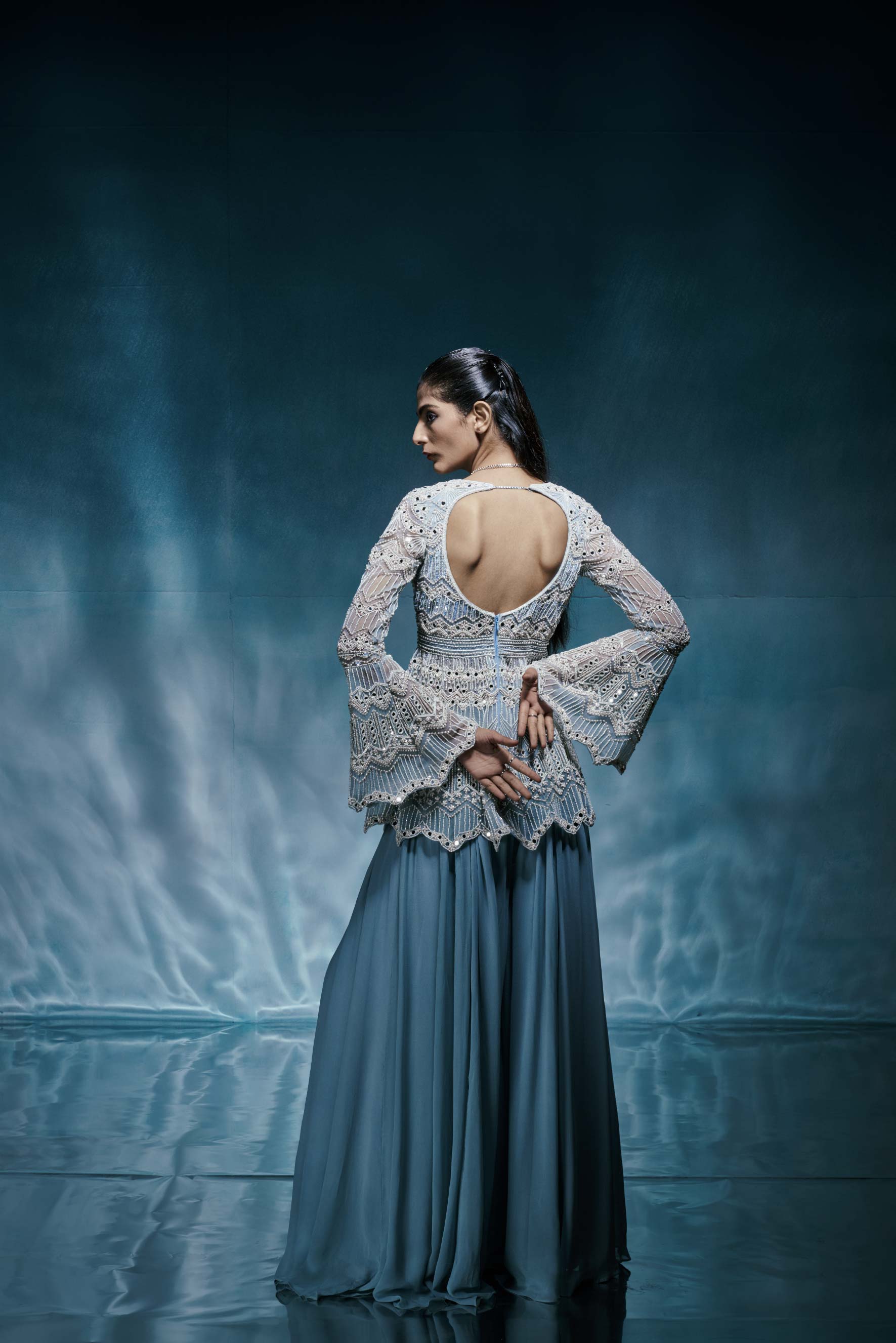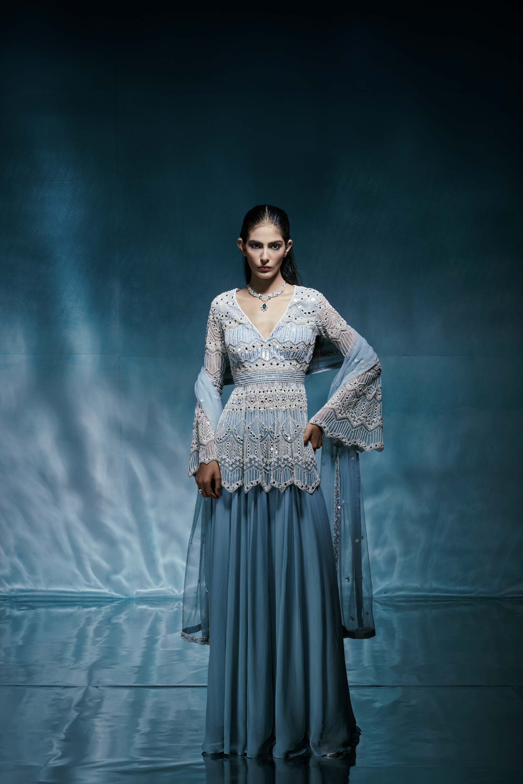 Hand embroidered peplum jacket accentuated with crystals and pearls paired with a fluid sharara and a net duppata.
