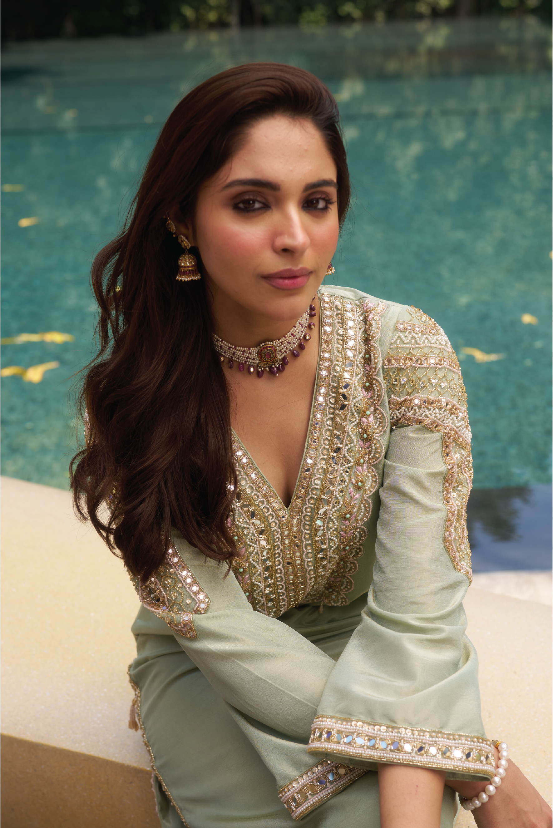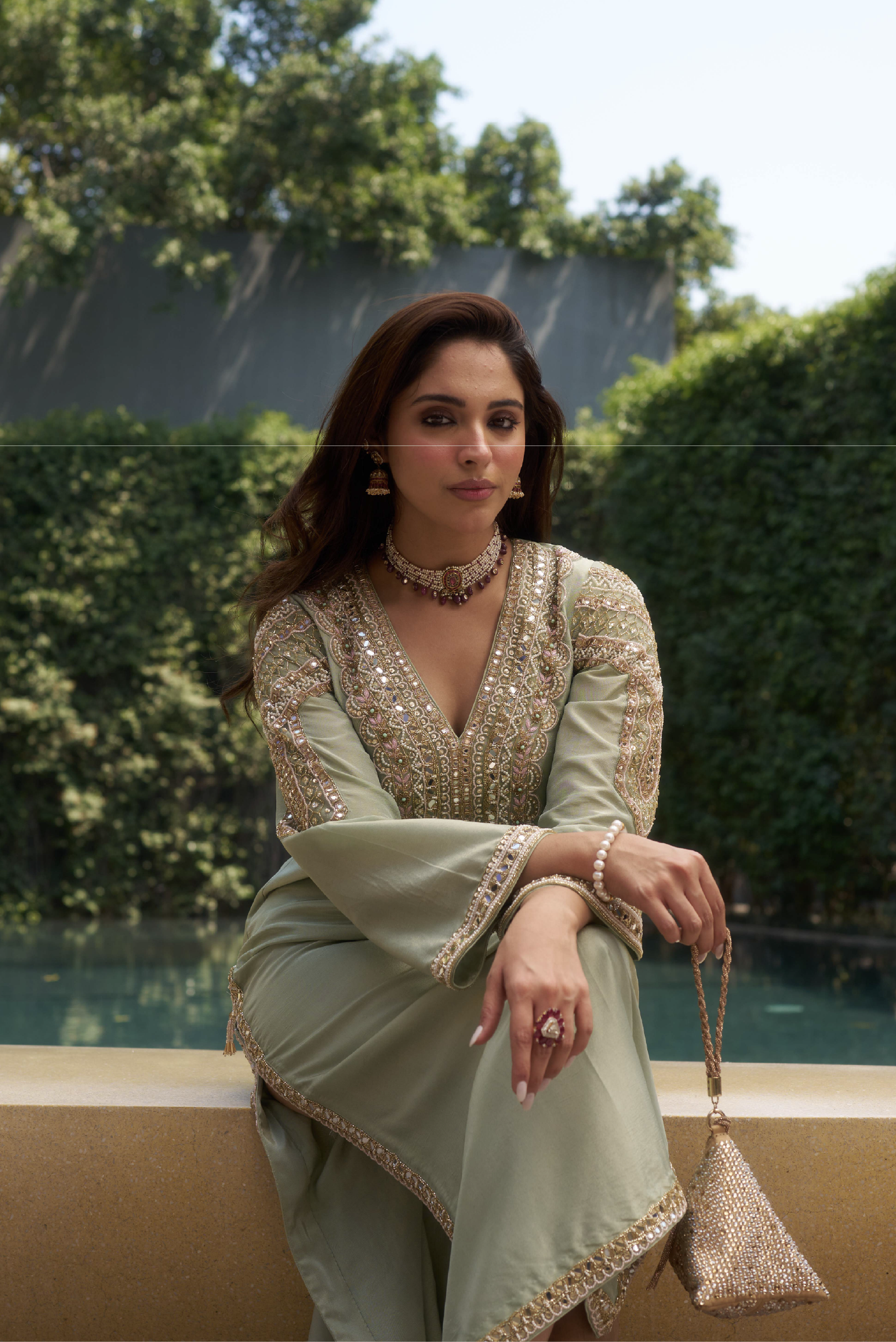 This mint kaftan in delicate tissue fabric is the epitome of effortless elegance, designed for those who embrace laid-back luxury. Adorned with intricate threadwork, mirror embellishments, and delicate beadwork, it brings a subtle sparkle to its flowing silhouette. The airy texture and relaxed fit make it an ideal choice for all your summer occasions.