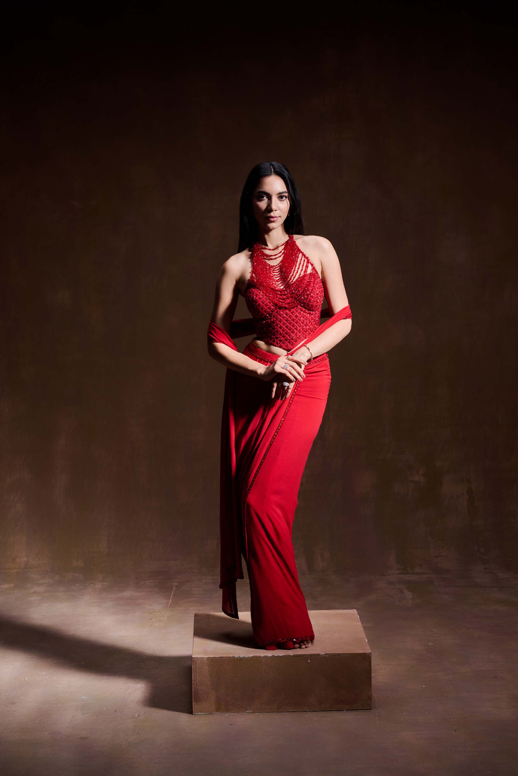 A striking pre-stitched saree in fluid red georgette, paired with a hand-embroidered corset blouse. The blouse features a statement illusion neckline layered with cascading beadwork, adding a bold yet elegant edge to the silhouette.