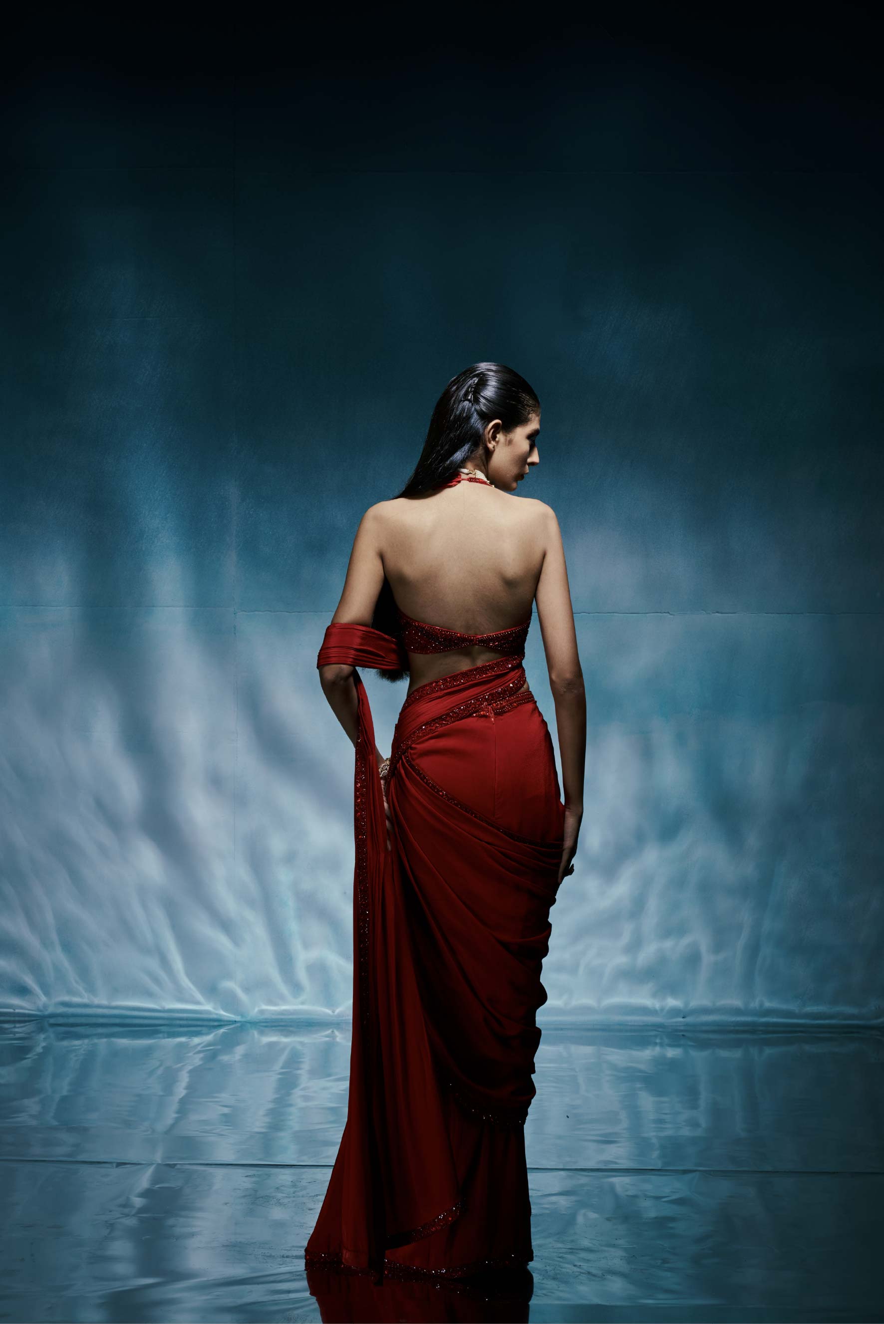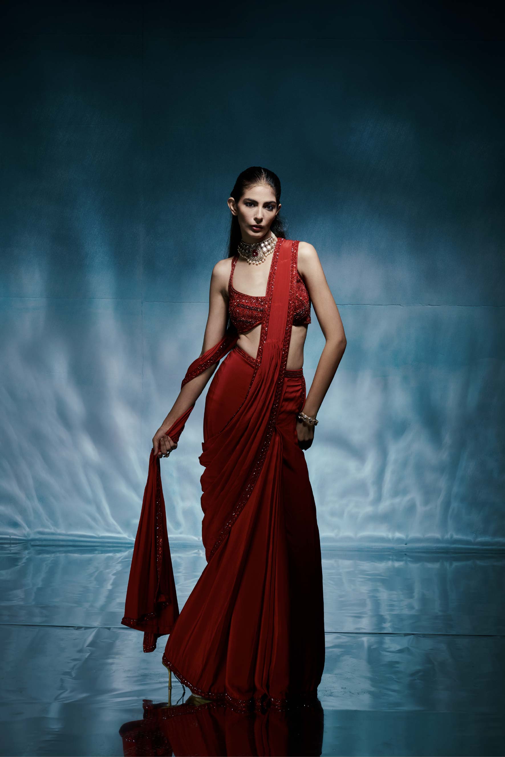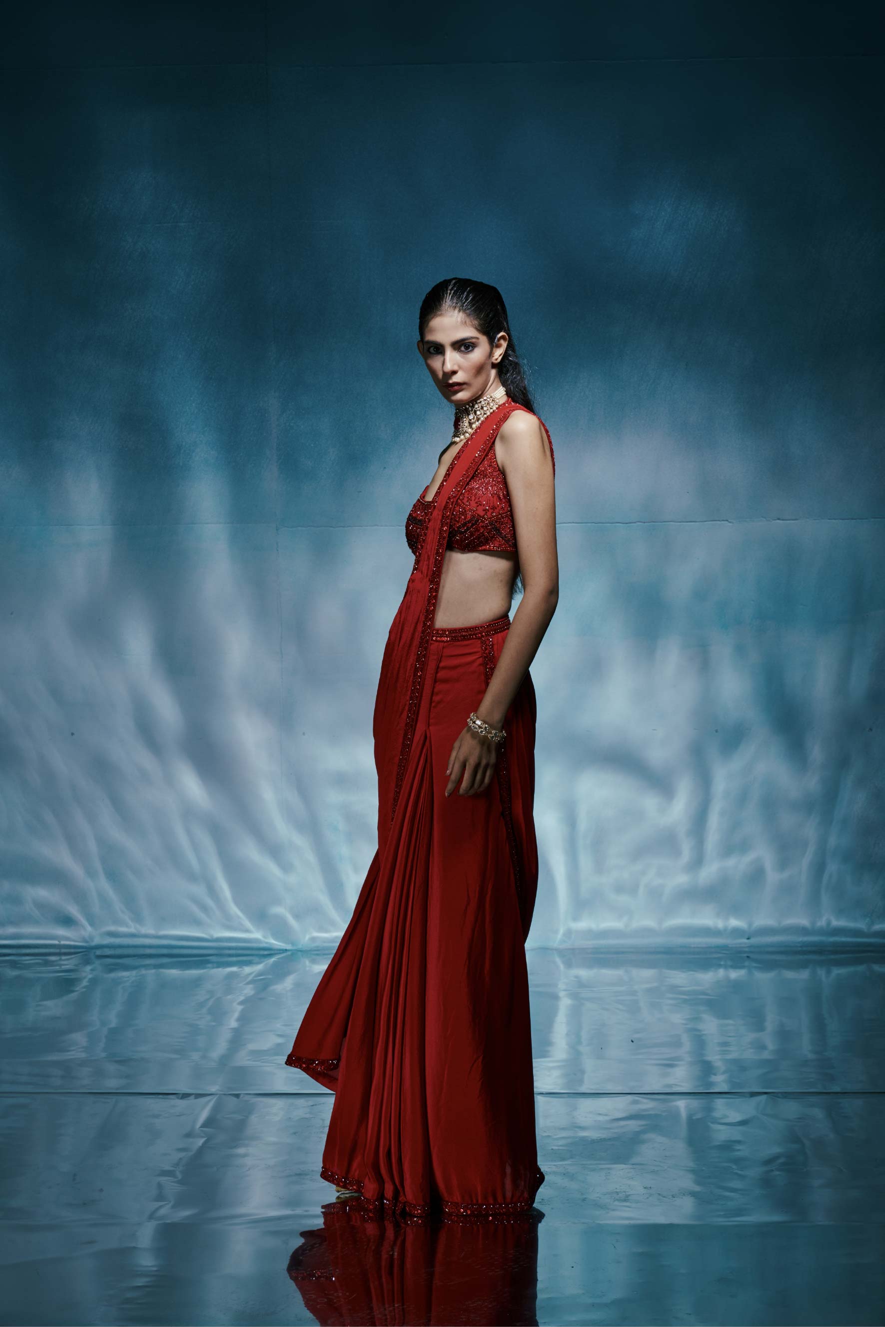 A bold pre-stitched red butterfly crepe saree with an intricately embroidered blouse crafted for statement evenings.